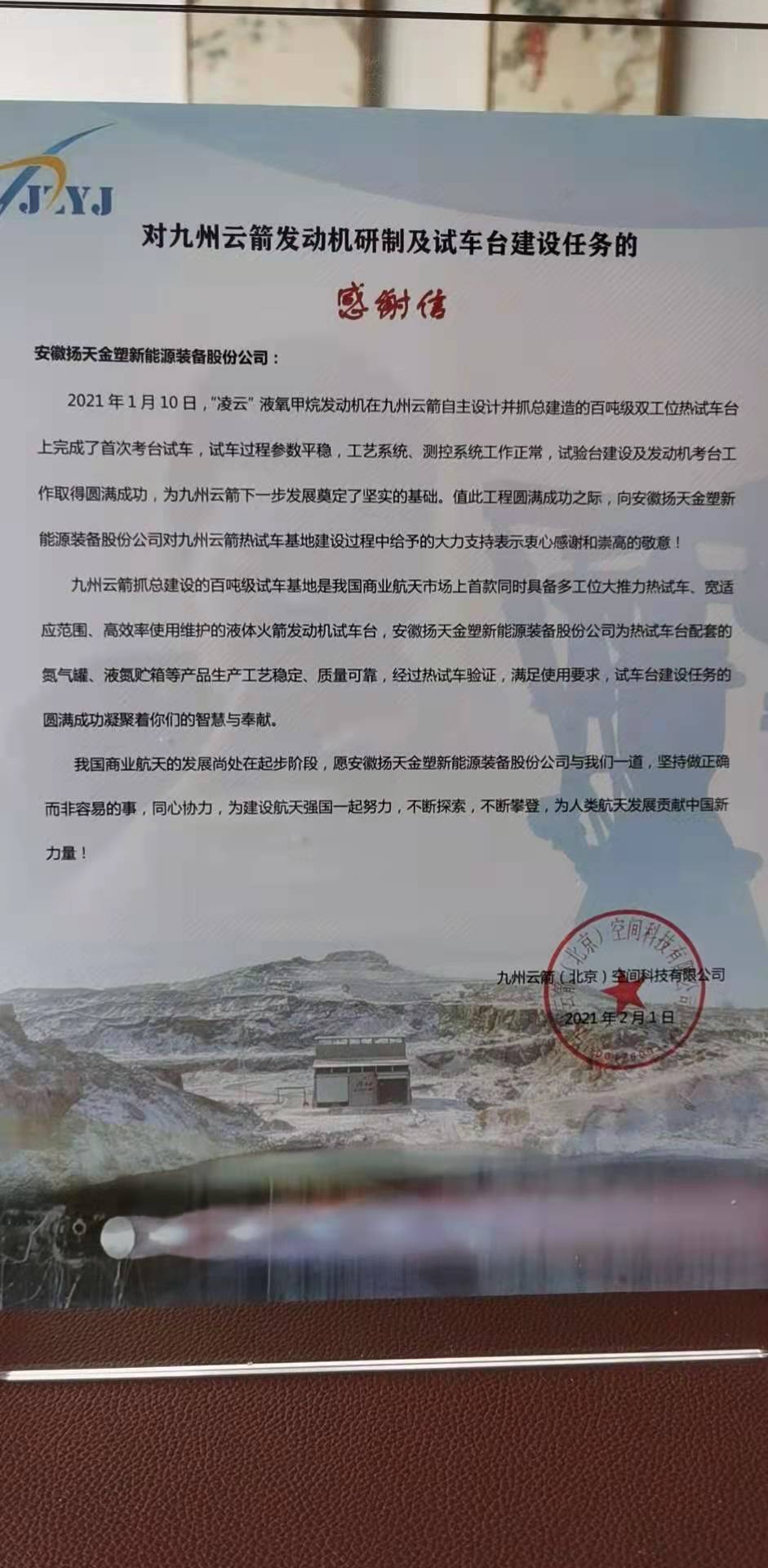 其次,非常感謝貴公司給予我們在本次熱試車基地建設工作中的肯定,能夠成為貴公司的合作伙伴,我們深感榮幸!更為能夠成為中國航天事業發展的建設者而自豪!